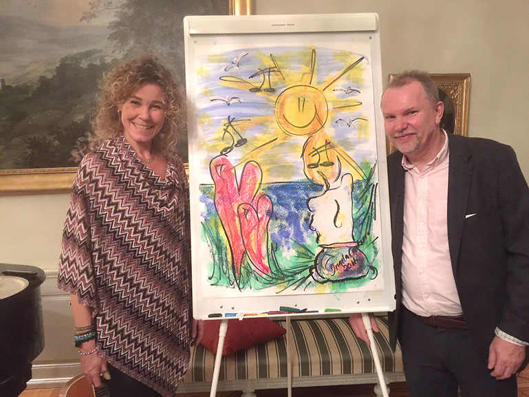 Efter middagen blev gästerna bjudna på underhållning av artisten, inspiratören, konstnären och glädjespridaren Ingela Carlson. De sjöng tillsammans och hon inbjöd också alla att dansa vals i stora salen på Residenset. Hur många har fått göra det?