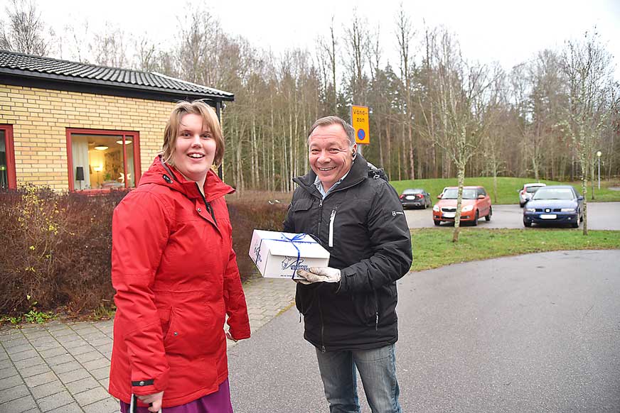 Johnny blir verkligen överraskad när vi med hjälp av Rebecka överräcker tårtan utanför Bokens dagcenter när han kommer för att hämta brukarna efter dagens jobb.